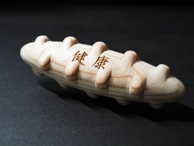 古来よりクルミや様々な形のグリップが伝えられて来ました。いつしか西洋医学の流れの中、民間療法とみなされ消えてしまいましたが、「何かしら握り締める」ことは、とても気持ちのいいもの。木製のグリップで適度な突起をつけた単純な形なのですが、度重なる試作を経て一番手のひらにフィットする形にたどり着くまで3年もかかりました。古来より伝えられているものは、やはり人類の体験に裏打ちされた真理と言えるでしょう。特許庁の意匠登録も取れ3D木工機も出現した事で実現しました。